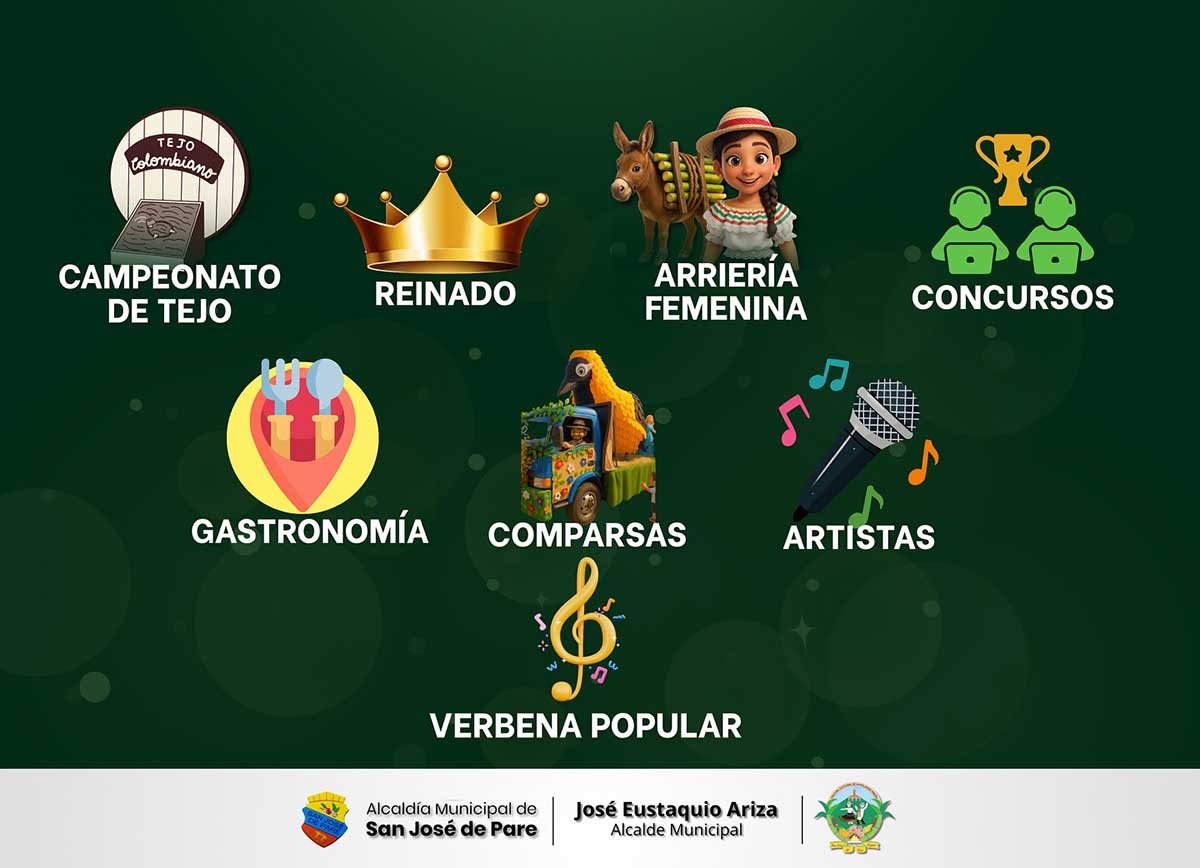 Reinado de la Molienda y Concurso de Carrozas. Concurso de Comparsas Pareñas. Concurso de Copleros. Concurso y Desfile Traje Típico. Concurso de Artesanías y Ponchos. Concurso de Danzas Folclóricas (alusivas a la molienda). Concurso de Música Tradicional. Campeonato de Tejo. Campeonato de Bolirana y juegos de la Molienda. Concurso Mula Sexy Pareña. Concurso de Arriería Femenina. Piquete Pareño. Segundo Concurso Mejor Panela Pareña.