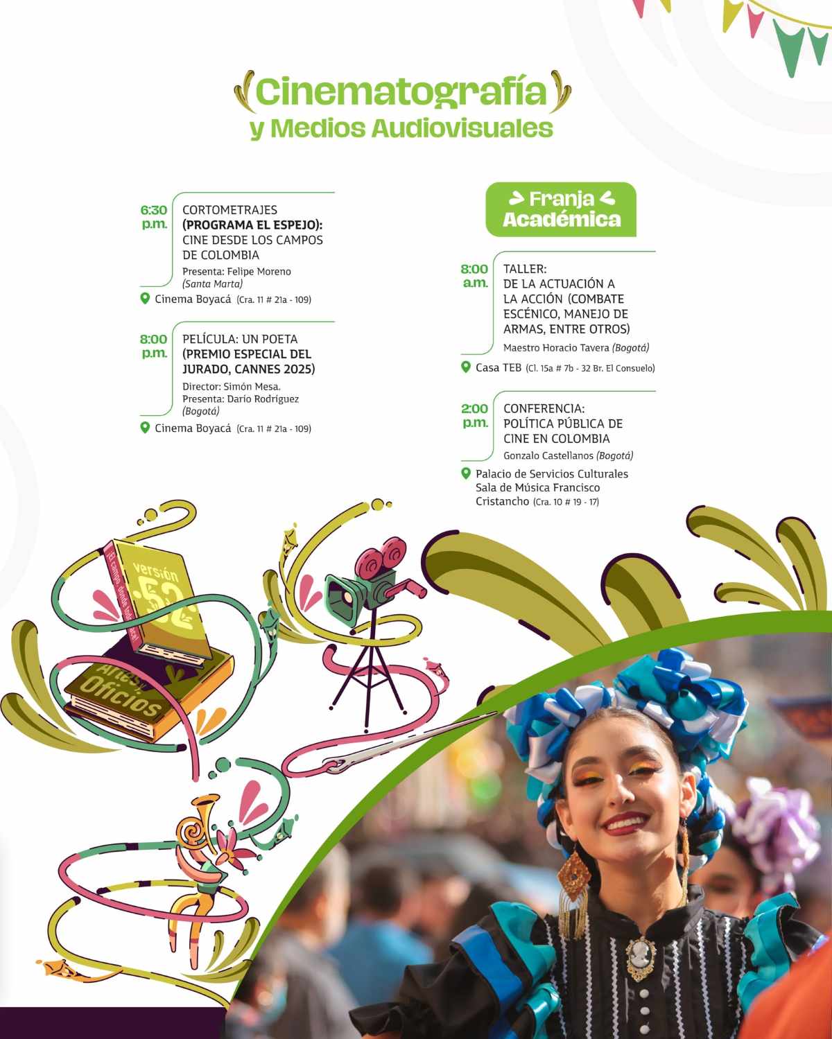 Circo. Música. Danza. Teatro. Cinematografía. Literatura. Artes plásticas. Patrimonio y Memoria. Narración Oral, Cuentería y Oralidades